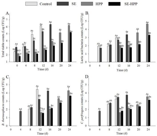 Effect of spice extracts and HPP, either alone or in conjunction, on the total viable counts (A), lactic acid bacteria counts (B), B. thermosphacta counts (C) and C. perfringens counts (D) of low-salt sausages during storage. The data were not reported if the TVC for a sample exceeded 5 Log CFU/g. Means with different uppercase letters (A–C) indicate significant differences among different treatments at the same time points (p < 0.05) and means with different lowercase letters (a–f) indicate significant differences among different times for the same treatments (p < 0.05).