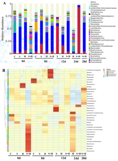 Effect of spice extracts and HPP, either alone or in conjunction, on the bacterial relative abundance (A) and hierarchically clustered heat map (B) at the genus level in low-salt sausages during storage. (C: Control group, S: SE group, H: HPP group, S + H: SE-HPP group).