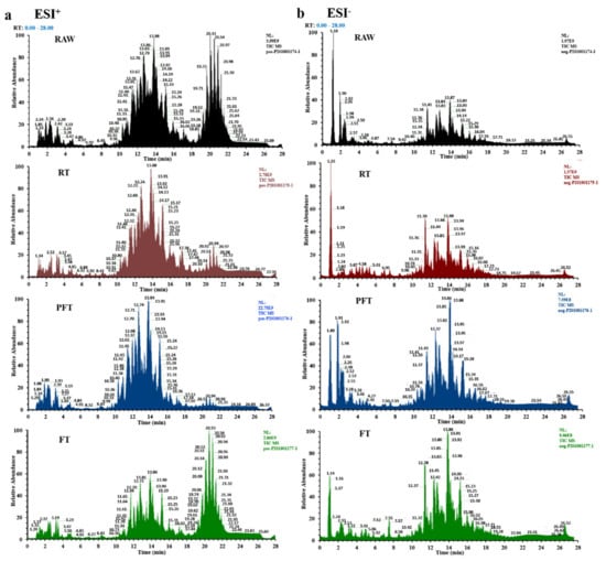 UPLC-Exactive Orbitrap/MS base peak intensity chromatograms of L. vannamei acquired in ESI+ (a) and ESI− (b) modes. Note: ESI+: positive electrospray ionization; ESI−: negative electrospray ionization; RAW: fresh group; RT: refrigerated treatment (4 °C); PFT: particle-freezing treatment (−2 °C); FT: frozen treatment (−18 °C).