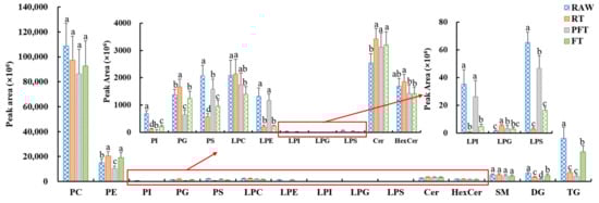 The lipid categories were displayed and compared using peak areas summarizing the individual lipids in the same class, as shown in Figure 2. The RT group showed de-crease of PC, PI, PS, LPE, LPI, LPS, DG, and TG, and increase of PE, PG, LPG, Cer, and HexCer, with no significant differences in LPC or SM. Unlike the RT group, the PFT group showed decrease of PE, PG, LPG, and HexCer, with an obvious difference in the numbers of lipid species except for PC, LPE, LPI, and SM. Unlike the PFT group, the FT group showed increase of PE, and obvious differences in LPE, LPI, and HexCer. As compared to the RAW group, the amounts of PI, PS, LPS, DG, and TG were decreased, while that of Cer was increased significantly. This may have great potential in terms of lipid composition changes during low-temperature storage.