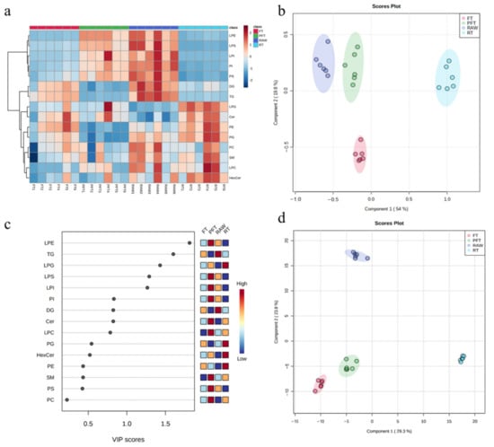 Multivariate statistical analysis of lipids in L. vannamei after low-temperature storage. (a) Heatmap of lipid species; each colored cell on the map relates to the peak area value of different lipid species; red indicates high, and blue indicates low. (b) PLS-DA score plot of lipid species. (c) VIP scores of lipid species in PLS-DA; the colored boxes on the right indicate the relative concentrations of different lipid species; red indicates high, and blue indicates low. (d) PLS-DA score plot of individual lipids. Note: RAW: fresh group; RT: refrigerated treatment (4 °C); PFT: particle-freezing treatment (−2 °C); FT: frozen treatment (−18 °C); PC: phosphatidylcholine; PE: phosphatidylethanolamine; PI: phosphatidylinositol; PG: phosphatidylglycerol; PS: phosphatidylserine; LPC: lysophosphatidylcholine; LPE: lysophosphatidylethanolamine; LPI: lysophosphatidylinositol; LPG: lysophosphatidylglycerol; LPS: lysophosphatidylserine; Cer: ceramide; HexCer: hexosylceramide; SM: sphingomyelin; DG: diglyceride; TG: triglyceride.