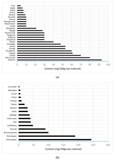 Mean content of Vitamin C in (a) fruits and (b) vegetables [2,18,27].