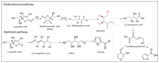 Alternative degradation mechanisms of L-ascorbic acid [28,29].