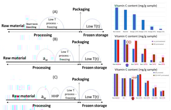 As pointed out in Reference [2], freezing has been considered as one of the most effective traditional preservation techniques for Vitamin C retention in fruit and vegetable products. Hot water or steam blanching, a short heat treatment, is frequently applied before freezing at the industrial level for some vegetables, which is found to slightly decrease water-soluble compounds, including L-ascorbic acid [46]. Alternatively, the use of chemicals (often called “chemical” blanching) can be effectively applied to avoid the heat degradation and water leakage of nutritional compounds [47,48]. In Xanthakis et al. 2018 [49], microwave-assisted blanching was proposed for frozen mangoes and shown to lead to a higher retention of the total Vitamin C in both low-temperature long-time and high-temperature short-time treatments. Nonetheless, obtaining the inactivation of the enzymes in all blanching procedures, this pre-treatment leads to an improved retention of Vitamin C during the subsequent frozen storage [50]. In order to improve the Vitamin C retention during frozen storage, a variety of pre-treatments, including an osmotic step, have been proposed, as will be explicitly discussed in the next section.