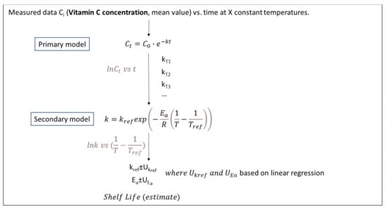 This section summarises the published works on Vitamin C degradation kinetics, aiming at analysing the effects of the main parameters. Regarding the mathematical approach, a detailed presentation on the alternative kinetic models proposed for Vitamin C degradation was provided by Peleg et al. 2016 [5]. In this work, the primary models (i.e., equations describing changes of the Vitamin C content vs. processing/storage times) available in the literature include first- and zero-order equations, as well as Weibullian kinetics and combined models, that take into account both aerobic and anaerobic degradation paths; the secondary models mainly include Arrhenius, the simpler exponential model, the D-z approach (based on the thermobacteriological principles), the square root model, the Eyring–Polanyi and other mathematical formulations. The main purpose of this paper was to use an interactive software (http://demonstrations.wolfram.com/SimulatingAscorbicAcidDegradation/ (accessed on 27 August 2021)) with which these equations can be applied in simulations, aiming also at reducing the number of chemical determinations in storage studies. Apart from reporting the mathematical equations used and the main results obtained, at the end of this section, an overview of the alternative kinetic approaches will be briefly and schematically outlined in an effort to underline the importance of estimating not only the value of the kinetic parameters involved but also the degree of their variability (also expressed by their uncertainty, confidence intervals or errors). This methodology, based, in some cases, on a stochastic approach, can provide a more realistic prediction of the expected nutritional quality of a product under conditions that simulate the realistic distribution chain.