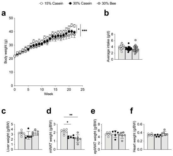 Compared with 15% casein-fed mice, 30% casein- (p = 0.026) or 30% bee-fed mice (p = 0.0006) had significantly reduced body weight, but this did not differ between groups fed with different protein sources (Figure 1a). Dietary intake did not differ between the groups (Figure 1b). Several tissue weights per body weight were compared, and it was found that mesenteric white adipose tissue was reduced in 30% casein- (p = 0.018) or 30% bee-fed mice (p = 0.002) compared with 15% casein-fed mice, implying that protein quantity was responsible for this difference (Figure 1c–f). Those results imply that bee larva protein did not show toxicity in mice during the 22-week intervention.