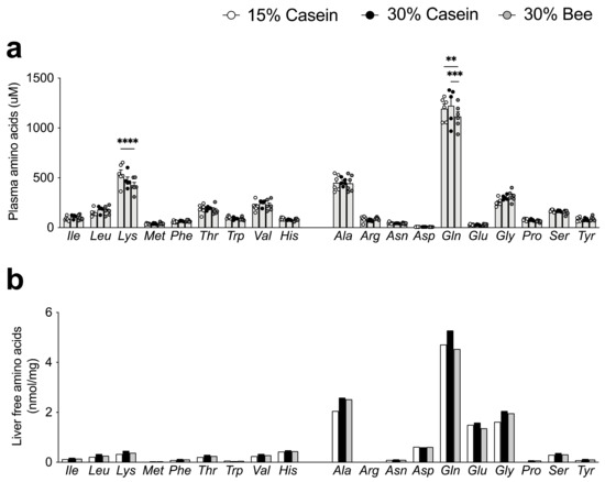 We examined how bee larvae-derived proteins affected plasma and liver amino acid levels in vivo. The evaluation of plasma essential amino acid levels showed that Lys was significantly lower in mice fed 30% bee than in 15% casein (p < 0.0001), but it was not different between 30% bee- and 30% casein-fed mice (Figure 2a). We next examined amino acid levels in the liver, where proteins are synthesized. However, decreased Lys levels in 30% bee were not found in the liver, implying that Lys was not deficient (Figure 2b). Among non-essential amino acids in plasma, Gln was lower in 30% bee-fed mice than in 30% casein-or 15% casein-fed mice, but other amino acid levels were similar among the different diet groups (Figure 2a).