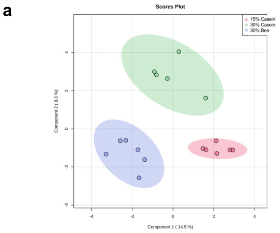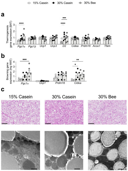 Histological analysis revealed that brown fat showed more miniaturized and polycystic adipocytes in high protein groups (30% casein, 30% bee) than in the 15% casein protein group and was more prominent in 30% bee (Figure 6c).