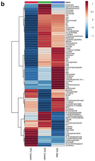 To understand the effects of bee larva in vivo, we analyzed the plasma metabolites by CE-TOF/MS. The sparse PLS-DA (sPLS-DA) found that groups were separated depending on different diets (Figure 3a). Heatmap analysis found that metabolites in 30% bee-fed mice were different, compared with 30% casein-fed mice (Figure 3b). The enrichment analysis found that nicotinate and nicotinamide metabolism and some amino acid-related metabolism was enriched in 30% bee-fed mice in comparison with 30% casein-fed mice (Figure 3c).