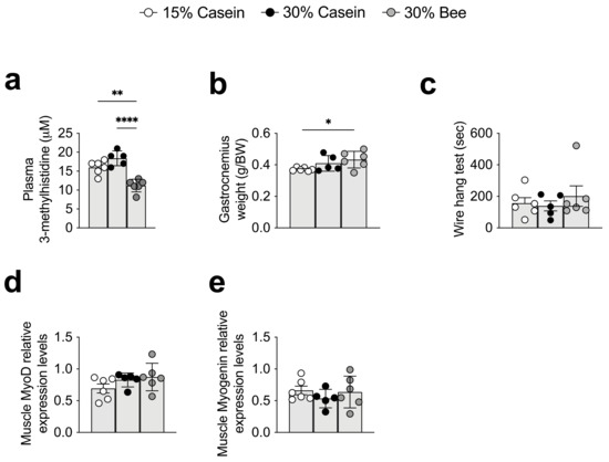 One of the decreased plasma metabolites of 30% bee-fed mice was 3-methylhistidine. 3-methylhistidine, which increases during muscle degradation, was decreased in 30% bee-fed mice compared with 30% casein (p < 0.0001) or 15% casein (p = 0.001)-fed mice (Figure 3b and Figure 4a). Since 3-metylhistidine has been recognized as a biomarker of muscle degradation, this result suggested that replacement by bee larva-derived protein did not cause amino acid deficiency. Indeed, gastrocnemius muscle weight was significantly higher in 30% bee- than in 15% casein-fed mice (p = 0.043), but did not differ between 15% casein- and 30% casein-fed mice, also implying that the replacement of bee larva protein from casein did not result amino acid deficiency and cause muscle degradation (Figure 4b). Consistently, results of the wire hang test also implied that muscle degradation was not found in bee larva protein-fed mice (Figure 4c). We further analyzed muscle regeneration-related genes to clarify bee larva’s muscle regeneration ability. Results showed that muscle regeneration genes Myod and Myogenin did not differ among groups (Figure 4d,e).