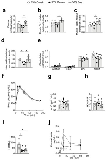 We found that plasma nicotinamide was significantly increased in mice fed 30% bee compared with those fed 30% casein (p = 0.021) (Figure 5a), and enrichment analysis using whole plasma metabolite consistently enhanced the nicotinamide pathway (Figure 3c). According to a previous study, nicotinamide improves obesity or type 2 diabetes through the NAD-Sirtuin signaling mechanism [34]; therefore, we further analyzed activities in muscle and adipose tissue, which are important tissues for controlling body weight or blood glucose control.