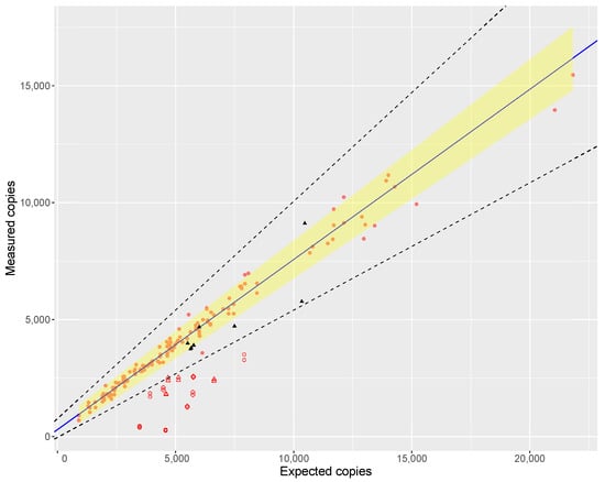 Figure 1 shows a clear correlation between the expected and measured copies with a slope close to one (1.138). However, the residuals plot (not shown) shows a non-constant variance for the residuals (heteroskedasticity). As a consequence the estimated standard errors are inconsistent. This can be overcome by using weighted least squares (WLS) to compute a prediction interval (i.e., the range of measurements in which 95% of all future observations are expected to lie) as shown in Figure 1, provided the samples have comparable purity of the reference sample. However, it should be noted that without explicitly formulating a model for the variance, the results obtained are not mathematically exact but approximate.