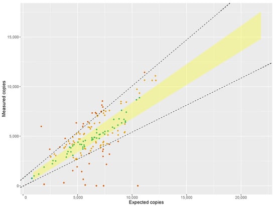 Overview of the market sample results: measured copies per sample plotted in function of their ’expected copies’, the shaded area represents the 95% prediction area based on the regression of the reference samples. The boundaries of the acceptable range (80% and 120% ddPCR purity) are shown as dashed lines. Samples have been colored depending on their categorization: green for 100% ddPCR purity, orange for 80–120% ddPCR purity, red for <80% or >120%.