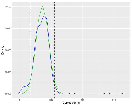 Density plot of the number of copies per ng template as measured by digital PCR in samples of high purity as confirmed by NGS. Dotted vertical lines indicate the boundaries between which 95% of the samples can be found. In green a normal approximation of the distribution is shown.
