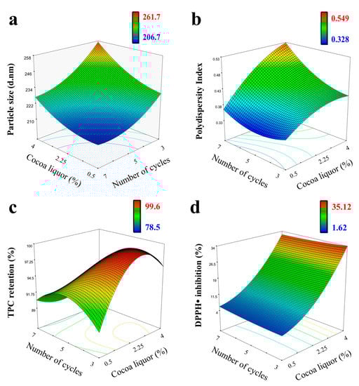 Three-dimensional response surface plot for the interactive effect of independent variables (cocoa liquor concentration and homogenization cycles) on: (a) particle size; (b) polydispersity index; (c) polyphenols retention; and (d) DPPH radical inhibition of the nanoemulsion with 8% of whey protein after microfluidization at 25,000 PSI (172.4 MPa).