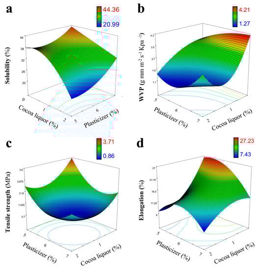 Three-dimensional response surface plot for the interactive effect of independent variables (cocoa liquor concentration and plasticizer concentration) on: (a) solubility; (b) water vapor permeability; (c) tensile strength; and (d) elongation at break of the whey protein-based films with 8% protein content.