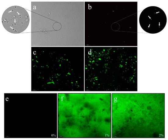 Microstructure of the (a) nanoemulsion with 8% Whey Protein Concentrate (WPC), 6% Glycerol (G), and 2% cocoa liquor (CL) diluted 5% in the bright field; (b) nanoemulsion with 8% WPC, 6% G, and 2% CL diluted 5%; (c) nanoemulsion with 8% WPC, 6% G, and 1% CL; (d) nanoemulsion with 8% WPC, 6% G, and 2% CL; (e) film with 8% WPC, 6% G without CL; (f) film with 8% WPC, 6% G, and 1% CL; and (g) film with 8% WPC, 6% G, and 2% CL observed by fluorescence with a Confocal Laser Scanning Microscope (CLSM). White arrows show emulsion droplets from an amplified field fraction. The scale bar represents a length of 10 µm. The green regions represent the autofluorescence of the cocoa liquor polyphenols.
