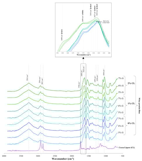 Comparison of FTIR absorbance spectra of the cocoa liquor and whey protein films with different cocoa liquor (CL) (0, 1, and 2%) and glycerol (G) (5, 6, and 7%) contents, indicating the most relevant absorption signals, and the signals associated with the different secondary conformations (α-helix, β-sheet, and β-turn) in the amide I region (1700–1600 cm−1) of the proteins in the films.
