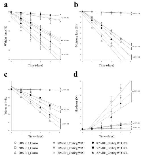 Effect of the coatings on the stability parameters of the muffins stored at 20 °C and different conditions of relative humidity (20, 50, and 80%): (a) weight; (b) moisture content; (c) water activity; and (d) hardness.