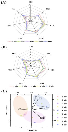 The radar chart of E-tongue in roasted lamb is presented in Figure 1A,B. The NMS and CTS sensors had the greatest response values, indicating that the umami and saltiness were the predominant taste. Liu et al. [4] and Xu et al. [5] found that the most predominant taste characteristics of roasted lamb were the umami taste, except for the saltiness taste caused by the addition of salt. The taste profile of the product was mainly affected by free amino acids and 5′-nucleotides, among which the umami taste was formed from the synergistic effect of the flavor 5′-nucleotides and free amino acids [24]. Among them, glutamic acid was the most important umami contributor in roasted lamb. The principal component biplot of E-tongue is shown in Figure 1C. The contribution rates of the first and second principal component (PC) were 48.3% and 32.5%, respectively, accounting for 80.8% variance in total, which indicated that PC1 and PC2 fully explained the taste of roasted lamb [15]. The differences in taste between the charcoal and electric-roasted samples were mainly caused by PC2 and the projections of the two samples were located in the negative or positive axis of PC2, respectively, indicating that the taste attributes in these two samples were significantly different and could be completely separated by the E-tongue. The projections of the charcoal and the electric at different roasting times were clearly separated in the biplot, suggesting that with the roasting time, the taste of roasted lamb changed significantly. Within the initial 2 min of roasting time, both the charcoal and the electric were located in the negative axis of PC1, close to each other, indicating that there was no obvious difference in taste attribute between them, and they were located near to the CTS sensors, suggesting that roasted lamb exhibited salty taste. When roasting time extended from 4 min to 8 min, a clear separation of the projections was observed; the charcoal-roasted sample was located in the negative axis of PC2, near to NMS and AHS sensors, suggesting that they exhibited higher taste of umami and sourness in E-tongue. However, the electric-roasted samples were located in the positive axis of PC2, close to ANS and SCS sensors, indicating that they exhibited the higher taste of sweetness and bitterness in E-tongue, which were caused by sweet amino acids and bitter amino acids [4]. The results of E-tongue strongly suggested that compared with charcoal, application of the electric significantly changed the taste profiles of the roasted tamarix lamb.