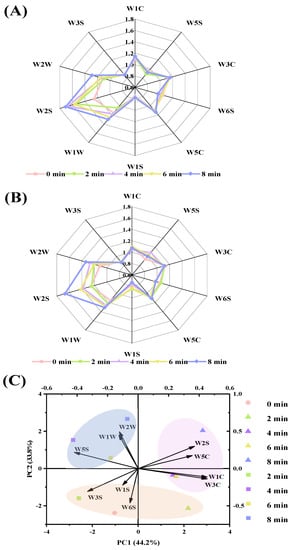 The radar chart of the E-nose in roasted lamb was presented in Figure 2A,B. The sensors, including W2S, W1W, W2W, W1C, W3C, and W5C, had stronger response values, which indicated that alcohols, aldehydes, ketones, alkanes, sulfides, and aromatic compounds were the predominant odor compounds. Liu et al. [25] also reported that the predominant odors of roasted lamb contained aldehydes, ketones, alcohols by flash GC E-nose and the results of GC-O-MS also showed that aldehydes and alcohols were the higher concentration chemicals in roasted lamb. Xiao et al. [26] and Liu et al. [4] also found that aldehydes and alcohols were the dominant compounds in roasted lamb by using HS-SPME/GC-MS. Du et al. [15] also found that smoked bacon might have higher contents of alcohols, aldehydes, ketones, and sulfides by E-nose. The principal component biplot of E-nose is shown in Figure 2C. The contribution rates of PC1 and PC2 were 44.2% and 33.8%, respectively, accounting for 78.0% variance in total, which fully explained the odor of roasted lamb [27]. The differences in odor between the charcoal and electric-roasted samples were mainly caused by PC1 and the projections of the two sample were located in the positive or negative axis of PC1, respectively, indicating that the odor attributes in these two samples were significantly different and could be completely separated by the E-nose. A clear separation of the projections was observed between charcoal and electric roasting from the beginning, suggesting that with extended roasting time, the odor of roasted lamb changed significantly. Within the initial 2 min of roasting, both the charcoal- and the electric-roasted samples were located in the negative axis of PC2, and they were near to W1S, W3S, and W6S sensors, which indicated that the samples had higher contents of hydrogen and methane. As roasting time extended from 4 min to 8 min, a clear separation of the projections was observed, and the charcoal-roasted sample was distributed in the positive axis of PC1, close to W1C, W3C, W2S, and W5C sensors, suggesting that they had higher contents of alcohols, aldehydes, ketones, alkanes, and aromatics. However, the electric-roasted sample was distributed in the negative axis of PC1, close to W5S, W1W, and W2W sensors, which suggested that they had higher contents of nitrogen oxides, terpenes, aromatics, and organic sulfur. The results of E-nose suggested that compared with charcoal, application of the electric significantly changed the odor profiles of roasted tamarix lamb.
