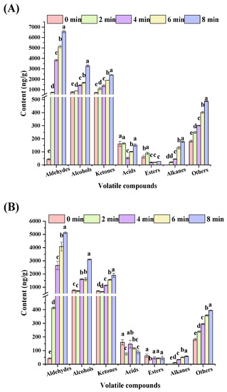 Profiles of volatile compounds in tamarix lamb roasted by charcoal (A) or electric (B). Different lowercase letters indicate that there is significant difference (p < 0.05).
