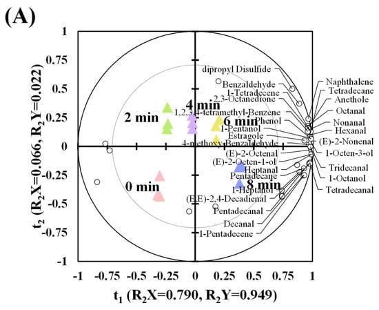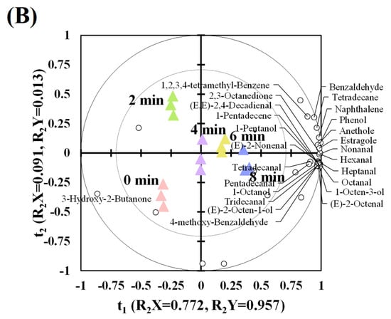 PLSR biplots showing the change of key volatile compounds in tamarix lamb roasted by charcoal (A) and electric (B) (triangle represented different roasting time, pink, green, purple, yellow, and blue represented 0 min, 2 min, 4 min, 6 min, and 8 min, respectively).