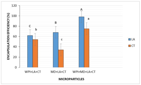 Encapsulation efficiency of microparticles. WPI + LA + CT, MD + LA + CT, and WPI + MD + LA + CT. WPI + LA + CT: Whey protein isolate + L. acidophilus + Charantin; MD + LA + CT: Maltodextrin + L. acidophilus + Charantin; WPI + MD + LA + CT: Whey protein isolate + Maltodextrin + L. acidophilus + Charantin. Different letters above each column represent significant differences in means (p < 0.5).