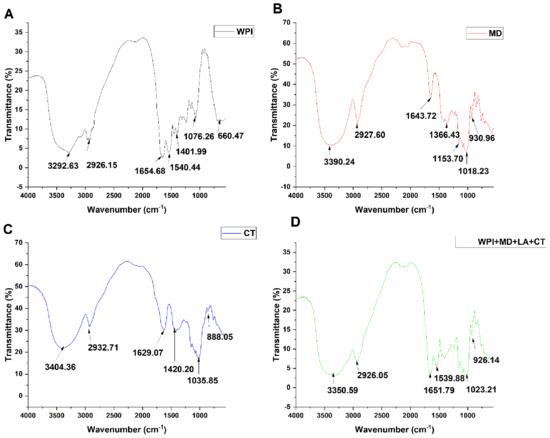 FTIR spectra of WPI (A), MD (B), CT (C), and WPI + MD + LA + CT (D).