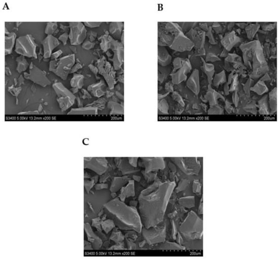 SEM images of freeze-dried microcapsules prepared with different wall material formulations are shown in Figure 3. Microparticles appeared fragmented, irregular in shape, with a flask-like structure. Similar structures for freeze-dried particles have been reported by previous studies [48,49,50]. The unevenness of the microparticles shape was attributed to the non-uniform drying of the various parts of the liquid droplets during the early stages of the freeze-drying process [51]. Moreover, the observed porosity was linked to the removal of water by sublimation occurring during the freeze-drying process, which often results in the creation of highly porous structures [52]. Besides, it is to be noted that different carrier materials affected the surface morphology of the microparticles. MD + LA + CT microparticles (Figure 3B) presented more fragmented structures, which might have been caused by the syneresis of polysaccharides microgel during freeze-drying. Compared to other encapsulates, WPI + MD + LA + CT (Figure 3C) presented a smoother and less porous surface. It was concluded that a more uniform structure was obtained for microparticles WPI + MD + LA + CT as a result of the strong binding properties of the two biopolymers as revealed by the FTIR analysis. In addition, the conjugation of WPI-MD may have exhibited higher gelling properties, thus reducing the porosity upon drying. In this regard, it was reported that the gel-forming properties of proteins can be enhanced by conjugation with maltodextrin [53]. Finally, the electrostatic affinity from the opposite charges interactions between the two biopolymers WPI and MD may have also contributed to a more dense and uniform stru.