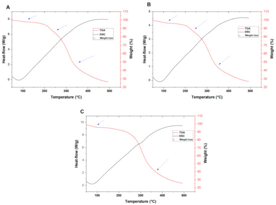 TGA-DSC curves of microparticles WPI + LA + CT (A), MD + LA + CT (B), WPI + MD + LA + CT (C). WPI + LA + CT: Whey protein isolate + L. acidophilus + Charantin; MD + LA + CT: Maltodextrin + L. acidophilus + Charantin; WPI + MD + LA + CT: Whey protein isolate + Maltodextrin + L. acidophilus + Charantin.