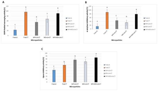 Microparticle functional properties: antioxidant activity (A), antidiabetic activity (B), and antiobesity activity (C). WPI + LA + CT: Whey protein isolate + L. acidophilus + Charantin; MD + LA + CT: Maltodextrin + L. acidophilus + Charantin; WPI + MD + LA + CT: Whey protein isolate + L. acidophilus + Maltodextrin + L. acidophilus + Charantin. Data represent means ± standard deviation. Different letters above each column represent significant differences in means (p < 0.5).