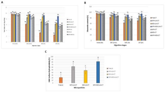 The CSH of probiotic bacteria is an indication of their adhesion capability to the host epithelium cells to colonize the gastrointestinal tract [74]. Considering that Lactobacilli strains adhesion capability can be altered through exposure to various environmental stresses including cold, heat, acid, and starvation [75], it is important to determine the protective capacity of carrier materials on the adhesion properties of the cells as affected by the encapsulation process. In this study, the CSH was determined based on the microbial adhesion to hydrocarbons (MATH) method which is one of the most common methods used to determine the hydrophobicity of cell surfaces [76]. Compared to other methods, the adhesion to hydrocarbons (MATH) presents the advantage of being easy to handle with a low operational cost [77]. The MATH assay is based on determining the adhesion of microorganisms to organic solvents (e.g., n-hexadecane, p-xylene, n-octane) after a short mixing with aqueous cell suspensions and subsequent phase separation. The results of the cell surface hydrophobicity are depicted in Figure 6C. It can be seen that free cells exerted a poor CSH (21%) compared to encapsulated microparticles. Oppositely, encapsulation enhanced the CSH of probiotics as proved by the higher CSH exerted by WPI-MD-LA-CT (82%), WPI-LA-CT (63%), and MD-LA-CT (48%). Besides, the high CSH of WPI-MD-LA-CT can be explained by the fact that blended formulations provided stronger protection to the probiotics cells in the in vitro digestive model, which in return enabled a higher adhesion capability marked by a high CSH.