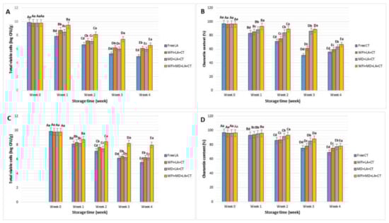 Storage stability at 25 °C for LA (A), CT (B), and at 4 °C for LA (C), CT (D). WPI + LA + CT (A), MD + LA + CT (B), WPI + MD + LA + CT (C). WPI + LA + CT: Whey protein isolate + L. acidophilus + Charantin; MD + LA + CT: Maltodextrin + L. acidophilus + Charantin; WPI + MD + LA + CT: Whey protein isolate + L. acidophilus + Maltodextrin + L. acidophilus + Charantin. Data represent means ± standard deviation. Different uppercase letters above each column represent significant differences for a sample between storage weeks (p < 0.5), and lowercase letters above each column indicate significant differences between samples within a week. (p < 0.5).