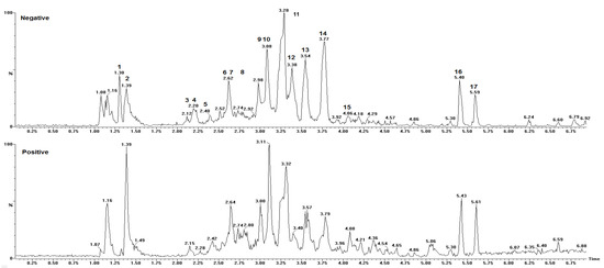A total of 17 peaks were identified, revealing the presence of compounds belonging to corresponding to two main classes of metabolites: phenolic acids and tannins. The compounds were eluted in a noticeably short period of time (6.9 min). Together, the retention time and the number of peaks observed in the present analysis indicate that UPLC is an efficient separation technique.