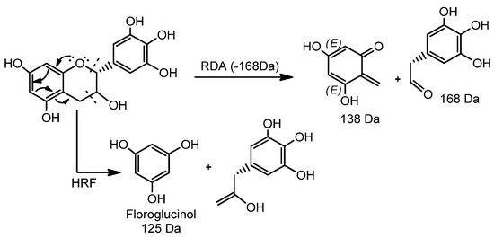 According to our analysis, peaks 4 and 9 exhibited protonated ions in m/z 171.0300 and 307.0824, respectively, which is compatible with the corresponding molecular formulas C7H6O5 and C15H14O7, as their fragmentation profiles are compatible with the reported for S. adstringens [5,33,35]. The fragmentation pattern id compatible with the mechanistic pathway of retro-Diels–Alder (RDA) reactions and the different heterocyclic cleavage of the C ring (HRF—heterocyclic fission) (Figure 2). In addition, the occurrence of dehydration was crucial for the identification of peak 9 epigallocatechin (EGC) [37].