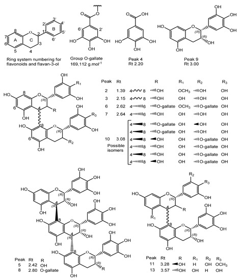 - de Mello, J.P.; Petereit, F.; Nahrstedt, A. Flavan-3-ols and prodelphinidins from Stryphnodendron adstringens. Phytochemistry 1996, 41, 807–813. [Google Scholar] [CrossRef]