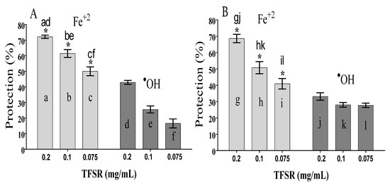 Considering the two different oxidant systems, it can be observed that TFSR protective activity against the pro-oxidant condition Fe2+ was significantly higher that observed against •OH radical produced in the Fenton reaction, as shown in Figure 4.