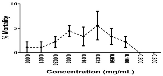 The preliminary toxicological analysis using A. salina showed that, in the range of concentrations evaluated (0.001 to 0.25 mg/mL), mortality below 10% was observed, with no statistical difference between the rates of mortality induced by each of the tested concentrations, indicating that the fraction has low in vivo toxicity under the experimental conditions adopted in the present study (Figure 5).