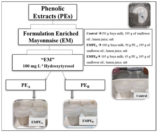 A schematic overview of the vegan mayonnaise production process is reported in Figure 1. The main ingredients used for the formulation were: soya milk, sunflower oil, lemon juice, salt and phenolic extracts (PEA and PEB). All ingredients were mixed using a lab-scale mixer (Bimby TM31, Vorwerk, Wuppertal, Germany) in a three-step process in order to maintain a closely packed emulsion. 1st step: soya milk and salt were mixed (1.100 g·min−1, 1 min, 37 °C); 2nd step: sunflower oil and lemon juice was slowly added under continuous mixing (2000 g·min−1, 3 min) until a mayonnaise emulsion had been formed; 3rd step: the PEA and PEB amounts corresponding to 100 mg L−1 of Hydroxytyrosol (respectively, 50 and 45 g) were incorporating to the mixture (300 g·min−1, 1 min). Mayonnaise samples were stored in capped containers and refrigerated at 10 °C for storage. All analyses were performed at 0, 15, 30 and 45 days of storage. The two enriched mayonnaises, EMPEA and EMPEB, were compared with a sample without PE, named control.