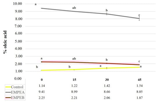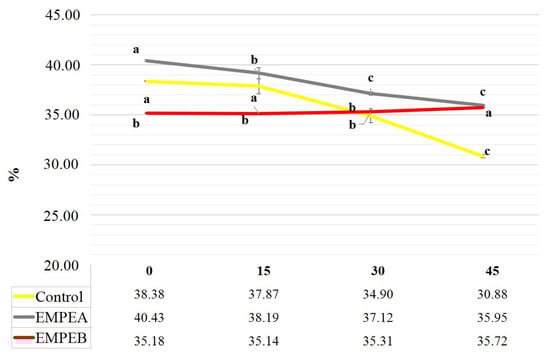 Food safety and quality are important to consumers. As it is well known, the pH, acidity values and moisture content play an important role in chemical and microbiological stability of fat foods. For this, in order to evaluate the potential application of PEs, all samples were subjects to chemical and microbiological analysis. The pH values of mayonnaise samples analysed at 1st time ranged from 2.92 to 5.01 (Control: 5.01 > EMPEA: 2.92 > EMPEB: 3.74), therefore, the addition of PE allows an acidification of the enriched samples. slightly lower pH value (Control: 4.97 > EMPEA: 2.97 > EMPEB: 3.85) were observed at the end of storage period (45 days) according to Rasmy et al. [31]. The two enriched samples showed a decrease of the TA during the time of storage (Figure 2), instead the control sample showed increase of acidity. The highest measured value was in the sample EMPEA (9.41 g Oleic acid 100 g−1 mayonnaise). The high acidity value is consistent with pH of PE (pH 2), that induced a decrease of emulsion pH and an increase of TA value.