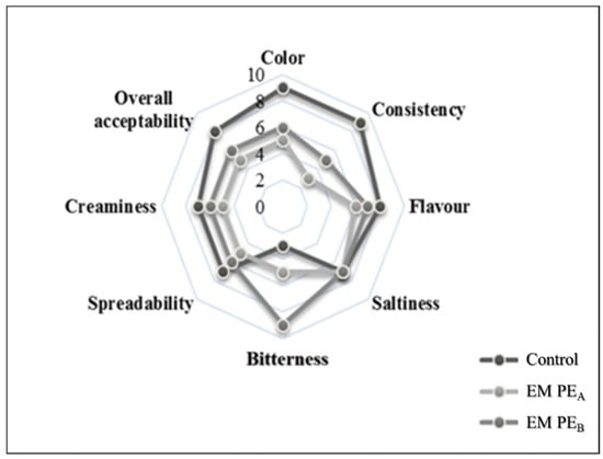 The enrichment with PE, leads to a variation of sensory parameters compared to the control sample (Figure 4). In general, all the tested samples showed differences for descriptors among them, except for saltness. Flavour, bitterness, spreadability were affected by the addition of PE; in particular, the increase of the perception of bitterness meant such as acid and pungent taste, was linked probably to the high acidity of the PEB extract (pH 2), as well as to the amount of oleuropein occurred in the enriched samples, acknowledged as responsible of bitter tasting. The natural proteins present in soya milk, determine the formation of the emulsion. Enriched Mayonnaise resulted less consistent than the control sample, probably due to the partial substitution of soya milk with PE. As described by Giacintucci et al. [32], the incorporation of PE in fact modifies the dispersion degree of emulsion with consequences on hardness, consistency end elasticity of samples. Overall, although the sensory evaluation reveals that the addition of PE interferes with the main sensorial attributes, the overall acceptability of EMPEB can be considered good compared to the control sample.