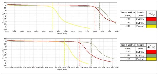 Oxidation curves at 1st and 45th day of storage: red (EMPEA), dark grey (EMPEB), yellow (Control).