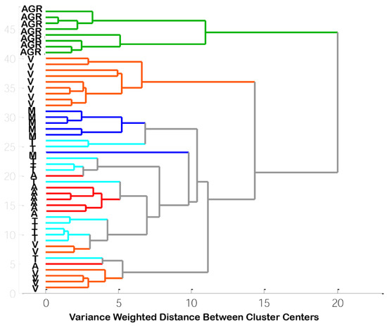 Dendrograms of five taxonomical different bivalve species based on element content (AGR-Agropectin irradians, A-Anadara broughtonii, M-Mizuhopecten yessoensis, T-Tegillarca granosa, V-Venerupis philippinarum).