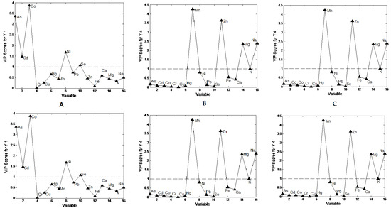 In the present study, PLS-DA, a supervised pattern recognition method, was used to extract maximum information on discriminant features/elements from the data and indicate the elements with highest influence on each species. The model was proposed based on the 48 samples of species and the 16 elements obtained from the metal content analysis. The number of the latent variables (LVs) was selected on the basis of the minimum value of RMSECV, which was achieved with three LVs. Classification and validation results for five models, expressed as R2cal, R2CV, RMSEC, and RMSECV, are presented in Table S5 (Supplementary material). The PLS-DA models for V. philippinarum, A. irradians, and M. yessoensis were statistically significant, with relatively high values of R2cal and R2CV, and low difference between RMSEC and RMSECV values. In contrast, the PLS-DA models for A. broughtonii and T. granosa had low values of R2cal and R2CV and low quality classification models (Table S5). The contributions of elements to the differentiation among species were analyzed using the VIP value. The models show very good results for the classification of Venerupis philippinarum, Argopecten Irradians, and Mizuhopecten yessoensis shellfish samples.