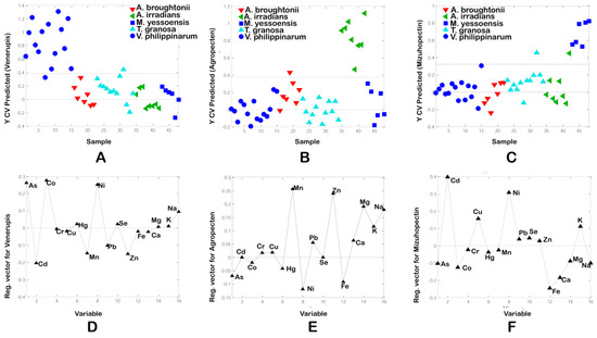 The standardized regression coefficient reveals the significance of an individual variable in the regression model. Co, As, and Ni contributed most to the PLS-DA model for V. philippinarum, while Cd had the most negative contribution to the model for this species (Figure 3A,D). As V. philippinarum had the highest and lowest As and Cd contents, respectively, these bioindicators of environmental pollution could be used to distinguish these species from others.