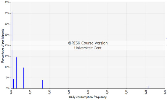 A total of 142 respondents between 20 and 64 years old filled out the food frequency questionnaire on clams and scallop’s consumption. Focusing on these two most important species of this work, Manila clam and Yesso scallop, a distribution expressing the chronic consumption as g/kg BW.day could be made. Table S7 (Supplementary Material) represents the raw data for Yesso scallop out of the survey, applied to construct a discrete distribution on consumption frequency represented in Figure 4.