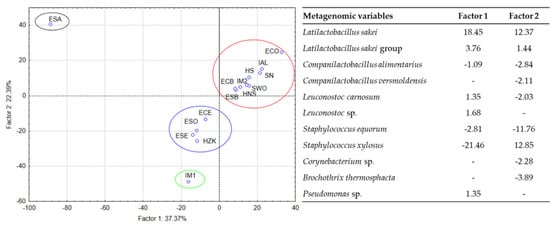 PCA factor coordinates for the first two factors explaining the variability of the microbial populations of the sausages according to the metagenomic analysis. The factor coordinates of the most relevant metagenomic variables (characterized by values higher than |1|) for the first two factors are also reported, which represent the projection of the metagenomic variables on the factor-plane.