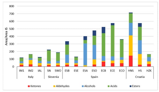 Table 6 reports VOCs derived from the microbial biochemical activities that occurred during sausage fermentation and ripening. The compounds are grouped into chemical families, whose total amounts are shown in Figure 3. Higher quantities of VOCs were found in some Spanish products and two Croatian samples.