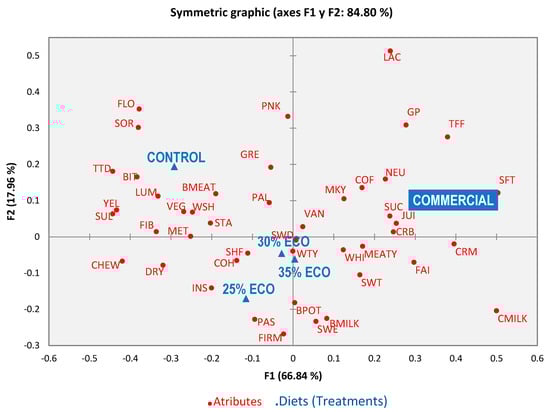 The first two dimensions of MFA accounted for approximately 57.92% of the variance of the experimental data. According to Figure 3, the F1 (29.91%) dimension collected the most considerable variation among diets, where the control contributed with 65.8%, while the 35% ECO showed 29.4%. The commercial treatment had the most important weight in F2 (28.01%) with 72.3%. Treatments 35% ECO and 30% ECO represented less than 26% whereas the 25% ECO remained very close to the center of the graphic. Although F3 does not appear in the graph, it should be noted that organic diets with amounts of ≥ 30% (30% ECO and 35% ECO) represented 64% of the variation in this axis. Consumers were able to separate commercial fish from experimental diets, they also discriminated between the control diet of the rest of the treatments with the organic feed addition, which made a small group among them.